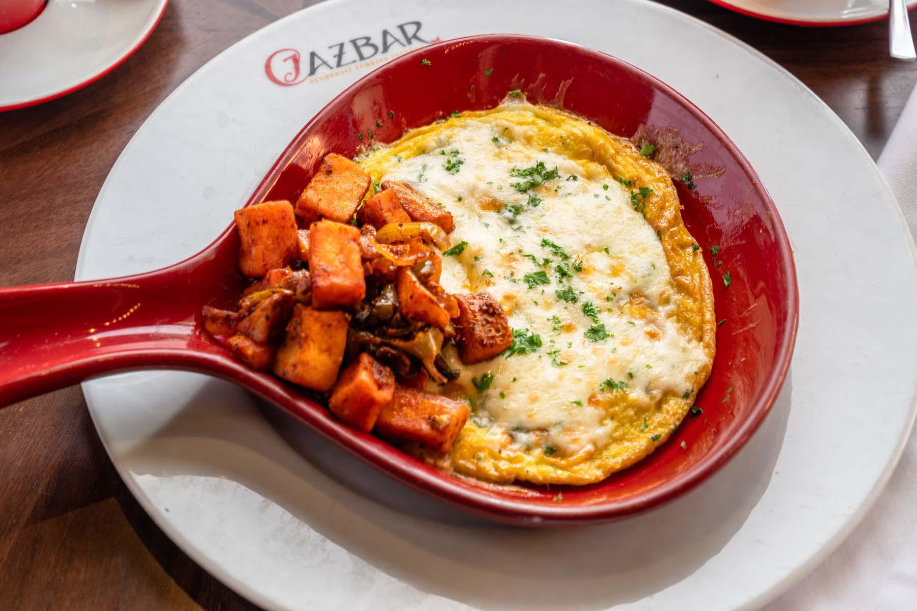 An open-faced, oven-baked Omelet set in a rustic ceramic bowl—fluffy eggs puffed golden, generously studded with melted Kaşar and tangy Feta Cheeses. Served straight from the oven with perfectly seasoned Home Fries and choice of Simit or Pogaca