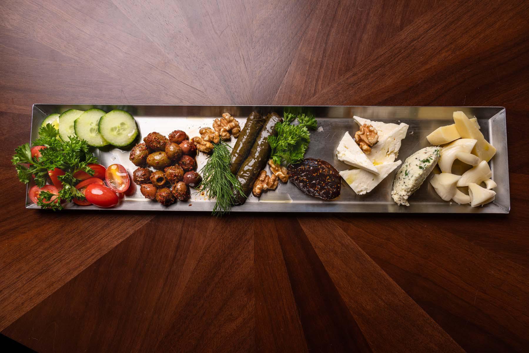 A lavish spread of cheeses—silky Orgu Braided, briny Feta, herbed Tulum, and nutty Kaşar—paired with sweet Fig Jam, Walnuts, stuffed Grape Leaves, juicy Tomatoes, crisp Cucumbers, and plump medley of Olives. A flavor voyage for the table