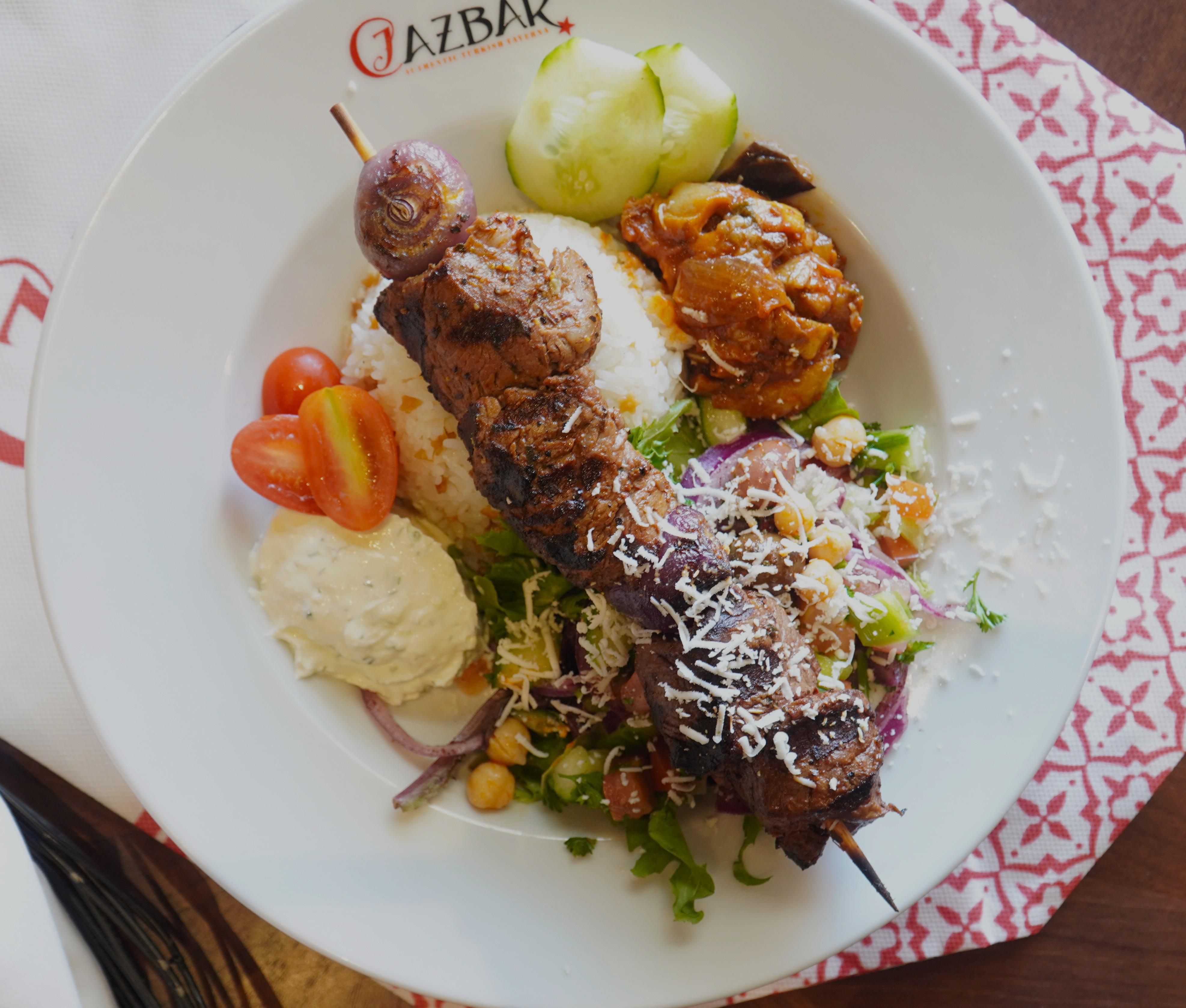 Succulent Fiilet Mignon Kebap over fluffy Rice and Mixed Greens, topped with Smoky Saksuka, Creamy Haydari, and Crumbled Feta. A luxurious Mediterranean bite